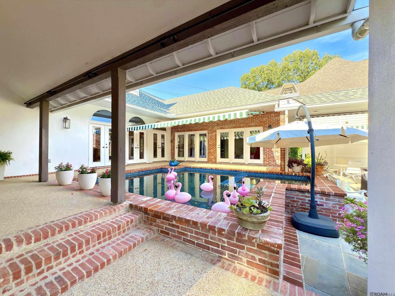 Just Minutes from LSU! Discover this exceptional property situated in a prestigious and established subdivision, just a 15-minute drive to LSU campus. This home offers a perfect blend of luxury, comfort, and outdoor living, making it an ideal retreat for families and professionals alike. Enjoy a true New Orleans-style courtyard crafted by Guy Oliver, featuring an inviting saltwater pool and relaxing hot tub. The courtyard includes two seating areas, a charming fountain, and a covered pergola, perfect for entertaining or tranquil evenings. Privacy and security are paramount with a 12-foot vinyl fence, complemented by a retractable Durasol Elite Awning with motorized operation, all designed by Eduardo Jenkins. The modern chef's kitchen boasts custom cabinetry, granite countertops, stainless steel appliances, a spacious island, and a stylish glass backsplash. A cozy keeping area with a gas fireplace provides a warm gathering spot. The home's versatile layout includes an interchangeable dining room, media room, and office area to suit your lifestyle. The expansive master bedroom offers stunning views of Walden Pond, creating a serene retreat. The spa-like master bath, designed with Greek Revival architecture, features double vanities, a soaking tub overlooking the rose garden, a large walk-in shower, and his & her closets by Closets by Design. The home features beautiful wood floors and porcelain tiles throughout the lower level, along with a media room equipped with Hunter Douglas cellular shades and picturesque views of Walden Pond. For added comfort and security, it has zoned air conditioning units and a whole-home Generac generator. Recent updates include a new roof in 2020, fresh exterior paint in 2023, updated gutters with leaf guards, and a new drainage system to keep the yard dry and well-maintained. The garage boasts epoxy flooring, new storage cabinets, a dedicated workshop room, and a new garage door, combining both functionality and style.