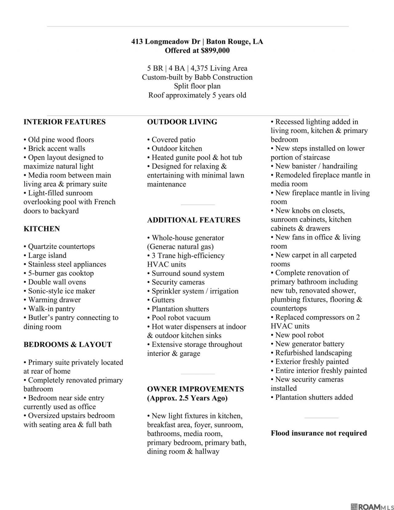 OPEN HOUSE SUN 3/8, 2:00 - 4:00. Custom-built & move-in ready. 5-BR, 4-BA home by Babb Construction is located in Fair Oaks Subdivision & offers a split floor plan with 4,375 square feet living area. Roof is approximately 3 yrs old. Primary suite located at rear of home separated from other bedrooms & includes a completely remodeled bathroom.Interior features include old pine wood floors, brick accent walls & open layout designed to maximize natural light. A dedicated media room/family room is located between main living area & primary suite. Kitchen is well equipped w/ stainless steel appliances, quartzite countertops, large island, 5 burner gas cooktop, double wall ovens, sonic-style ice maker, warming drawer, walk-in pantry, abundant cabinetry & butler's pantry connecting to formal dining room. A light-filled sunroom overlooks the backyard with French doors providing access to the pool area. Laundry room includes a sink, room for a fridge & additional storage cabinets. Across from the laundry room near the side entry is a bedroom currently used as an office but large enough to comfortably accommodate a queen bed with bedroom furniture. Outdoor living includes a covered patio, outdoor kitchen, heated gunite pool & hot tub designed for relaxing & entertaining with minimal lawn maintenance. The 2nd floor features an oversized bedroom with space for both sleeping & seating areas, ample closet space & full bathroom. Additional features include a whole-house generator (Generac 32W Natural Gas), surround sound, 3 Trane High Efficiency HVAC units, security system w/ cameras, sprinkler system/irrigation, gutters, plantation shutters, updated lighting & ceiling fans, enhanced landscaping, pool robot vacuum & hot water dispensers at both indoor & outdoor kitchen sinks. Extensive storage throughout interior & additional storage space in garage.Recent updates include fresh interior & exterior paint & replacement of compressors on 2 AC units. Flood insurance not required.