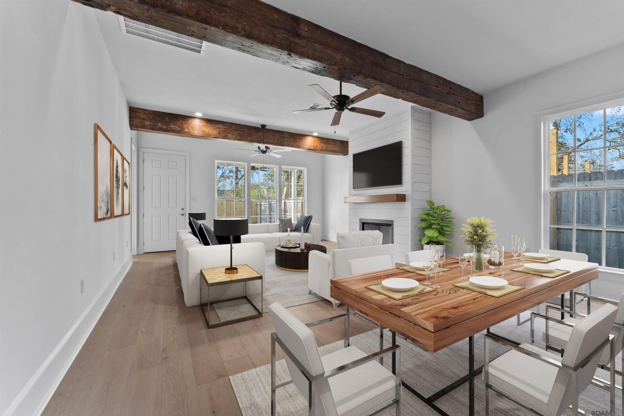740 Acadia Street features a beautifully designed new construction home offering approximately 2,000 square feet of modern living space. This 3-bedroom, 2.5 bath residence boasts soaring 10-foot ceilings, hardwood floors, and an open-concept living area highlighted by a fireplace and large decorative beams that add warmth and character. The kitchen is equipped with high-end appliances and a spacious island, ideal for barstool seating and entertaining. The primary bedroom is conveniently located downstairs and features a large walk-in closet and a luxurious primary bath with a large shower and a separate soaking tub. Upstairs, you'll find two additional bedrooms and a full bath, providing comfortable accommodations for family or guests. The front entrance boasts an outdoor kitchen and a dedicated entertaining area, perfect for gatherings. At the rear of the home, a large porch overlooks a versatile outdoor space ideal for pets, gardening or additional entertaining.