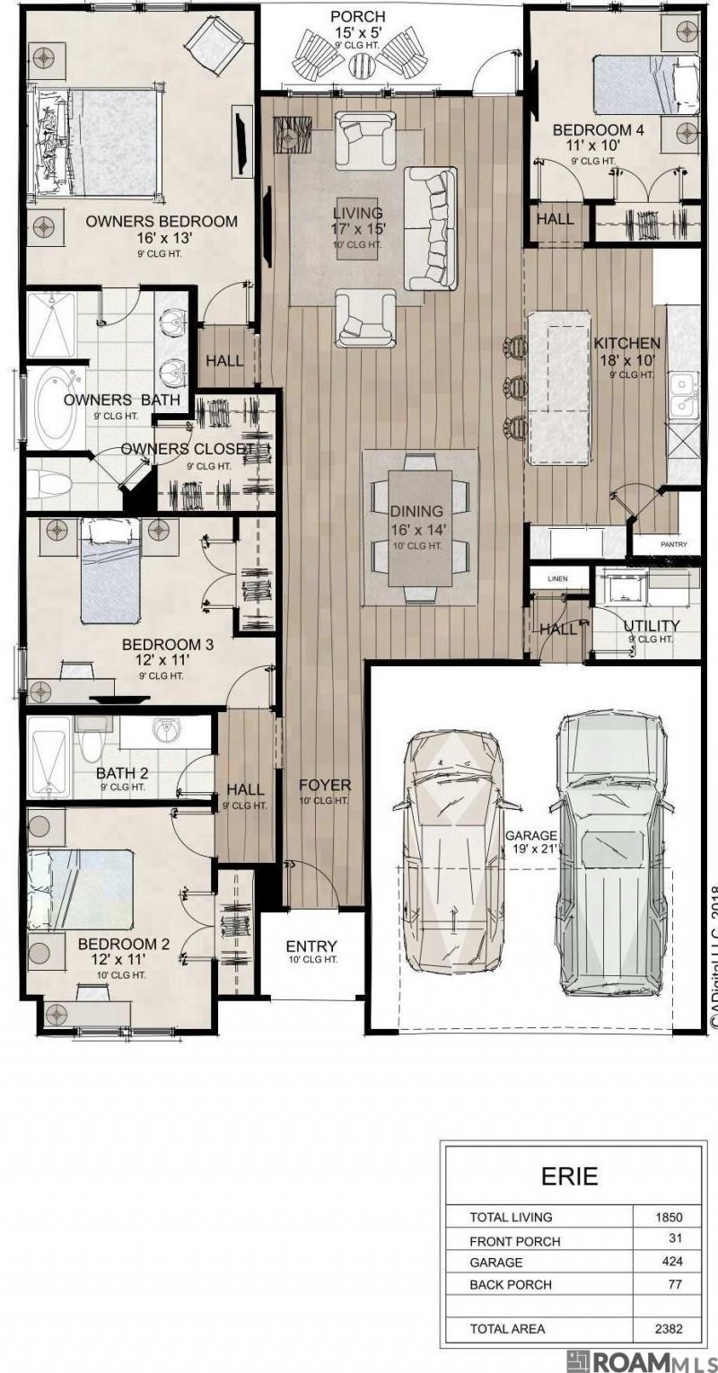 4.99% (5.73%) interest rate on GOV loans + closing cost assistance available! *TO BE ELIGIBLE FOR A LOW INTEREST RATE ON GOV LOANS & CLOSING COST ASSISTANCE, A BUYER MUST USE SELLER'S PREFERRED MORTGAGE & TITLE COMPANY. NOT AVAILABLE ON ALL HOMES. OTHER RESTRICTIONS APPLY. CONTACT COMMUNITY SALES MANAGER FOR DETAILS.* The Erie is a single-story, 4-bedroom, 2-bath home offering 1,850 sq ft with an open layout and 10' ceilings. The kitchen features a large island, gas cooktop, and walk-in pantry. The private owner's suite includes dual vanities, a walk-in shower, garden tub, and spacious closet. Bedrooms 2 and 3 share a front bath, while Bedroom 4 is privately located near the kitchen. Includes a utility room, 2-car garage, and WiFi-enabled SmartHome features. Upgrades: Upgrade Carpet to Vinyl LV2: (Primary BR+Closet/BR2/BR3/BR4) LV3 Tile LV2 Gourmet Kitchen w/ Vent Hood LV2 Granite Cabinets to the Ceiling LV3 Tiled Shower with Frameless Door LV2 Cabinet Hardware LV2 Lighting Package