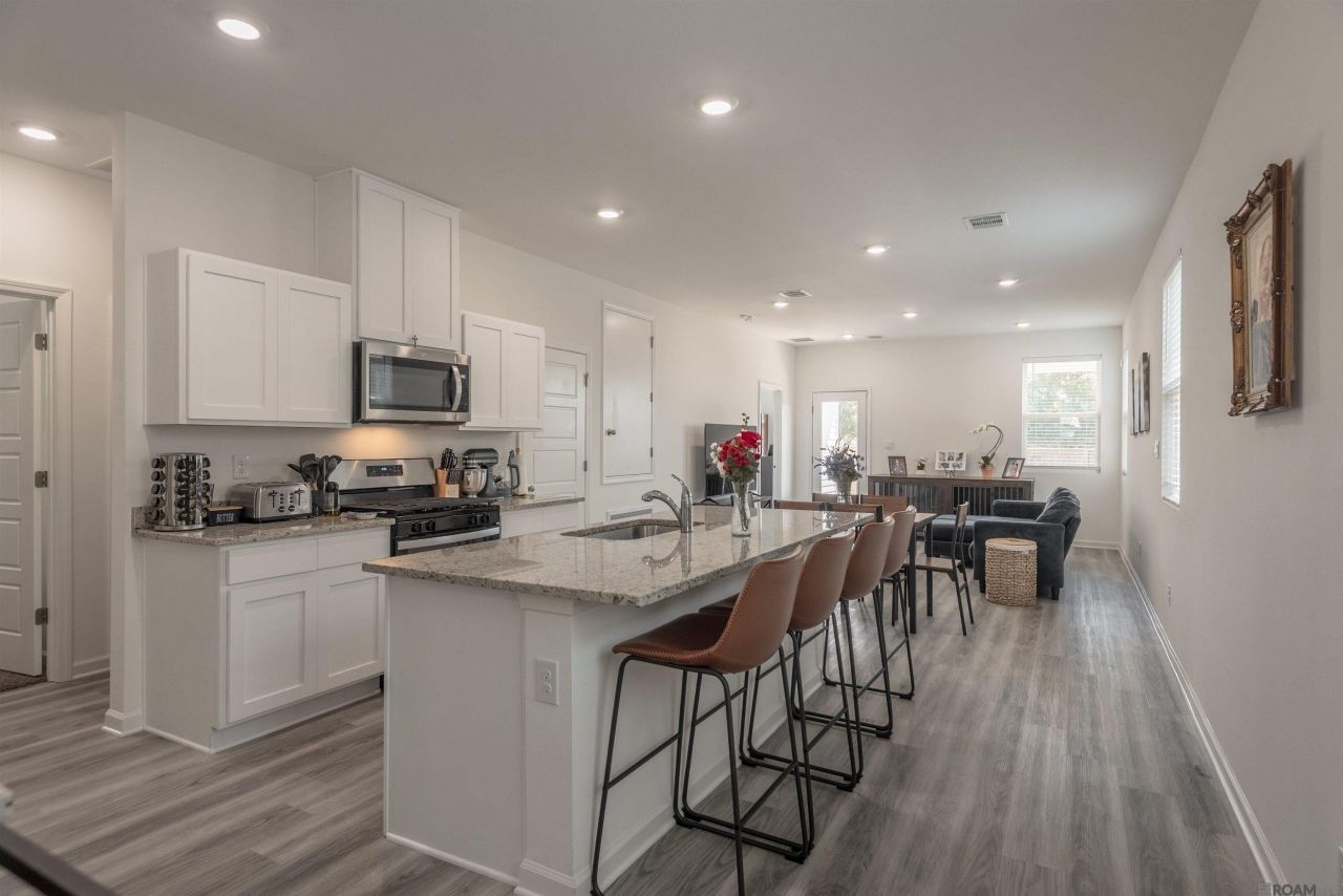 Experience the perfect blend of modern style and effortless living in this stunning, three-year-old home located in the highly sought-after Pelican Lakes community off Burbank Drive. Ideally situated just minutes from LSU, this residence is a premier choice for first-time homebuyers or students looking for a sophisticated home base near campus. The open-concept floor plan is anchored by a chef-inspired kitchen, featuring slab granite countertops, sleek stainless steel appliances, an expansive prep island, and a breakfast bar with seating for four. Designed for easy entertaining, the home boasts a seamless flow from the kitchen into the bright dining and living areas, accented by durable luxury vinyl plank flooring. The primary suite serves as a private retreat, complete with dual vanities, a separate water closet, and a generous walk-in closet. Beyond the interior, enjoy your own private oasis on the covered back patio overlooking a fully fenced yard. Residents of Pelican Lakes also enjoy exclusive access to the community pool and a clubhouse equipped with fitness equipment. Combining a prime location with move-in-ready convenience, this home offers a lifestyle of comfort and ease.